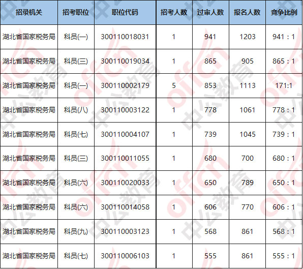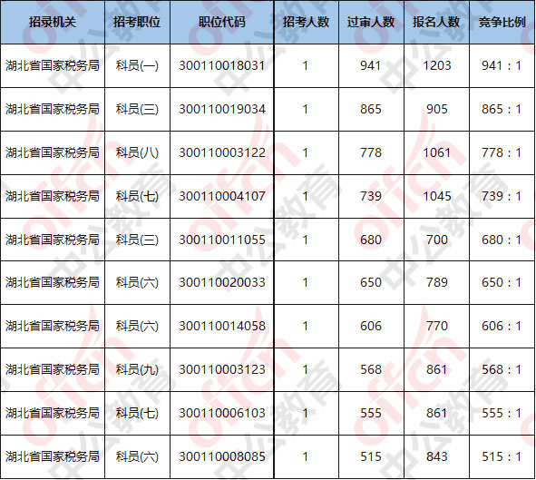 報(bào)名通過審核人數(shù)前十的職位主要集中在湖北省國家稅務(wù)局、武漢鐵路公安局等部門,具體信息如下: