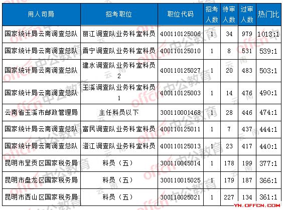 當前最受歡迎的崗位是國家統(tǒng)計局云南調(diào)查總隊,麗江調(diào)查隊業(yè)務科室科員,職位代碼:400110125006,招錄1人,1013人報名,其中34人待審核通過,詳情如下圖: