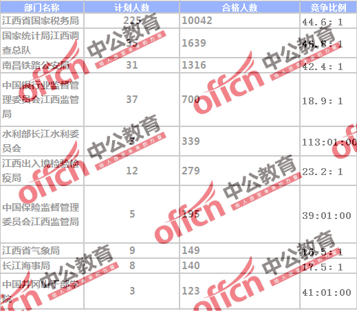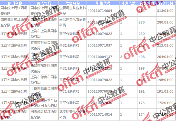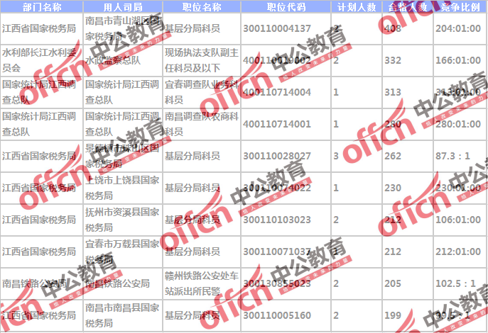報(bào)名通過(guò)審核人數(shù)前十的職位主要集中在國(guó)家統(tǒng)計(jì)局江西調(diào)查總隊(duì) 水利部長(zhǎng)江水利委員會(huì) 江西省國(guó)家稅務(wù)局等部門(mén),具體信息如下: