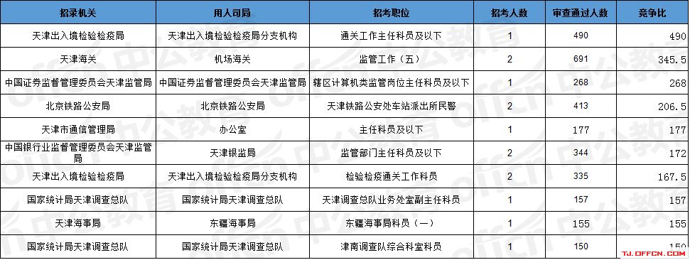 報名通過審核人數(shù)前十的職位主要集中在天津海關(guān)、北京鐵路公安局、天津出入境檢驗檢疫局等部門,具體信息如下: