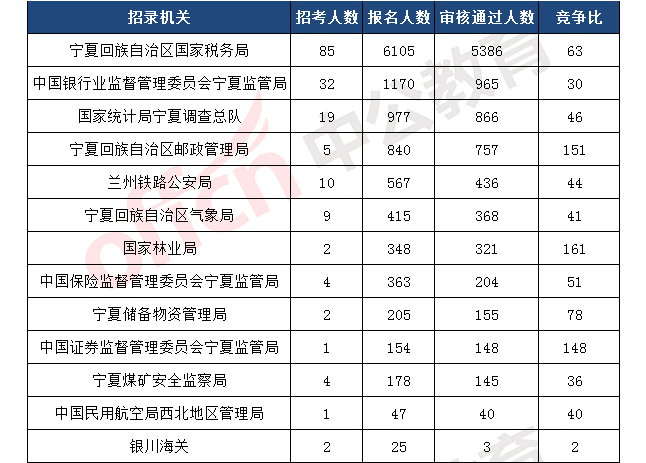 截止到11月8日9時,報名通過審核人數(shù)前十的職位主要為寧夏回族自治區(qū)國家稅務局、寧夏回族自治區(qū)郵政管理局,具體信息如下: