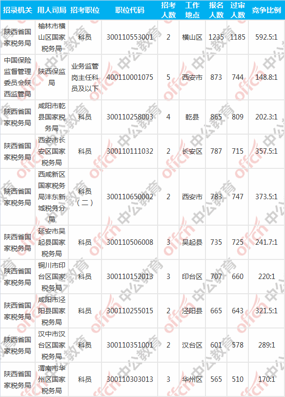 報名人數(shù)前十的職位主要集中在陜西省國家稅務(wù)局、中國保險監(jiān)督管理委員會陜西監(jiān)管局兩大部門,具體信息如下: