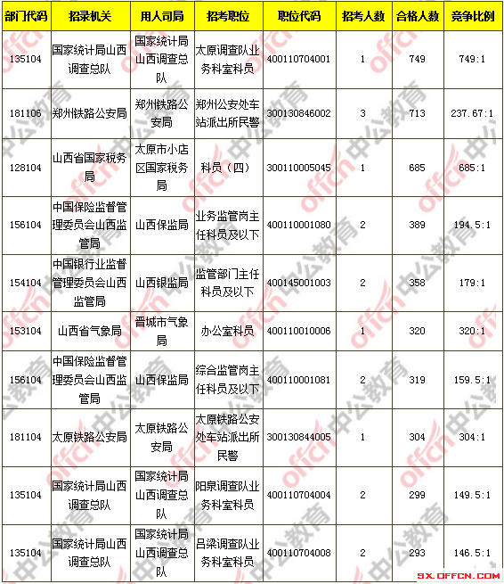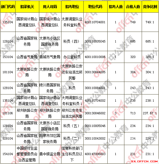 報名通過審核人數(shù)前十的職位主要集中在國家統(tǒng)計局山西調(diào)查總隊、鄭州鐵路公安局、山西省國家稅務局等部門,具體信息如下: