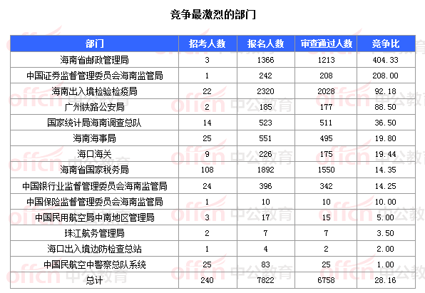 為幫助廣大考生更清晰的了解今日?qǐng)?bào)名情況,中公網(wǎng)校整理了審核通過(guò)人數(shù)的部門以及競(jìng)爭(zhēng)比例最激烈的部門,供廣大考生參考: