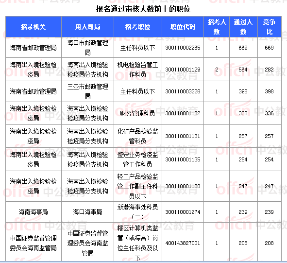 報名通過審核人數(shù)前十的職位主要集中在海南省郵政管理局、海南出入境檢驗檢疫局、海南海事局等部門,具體信息如下: