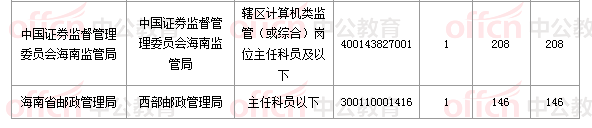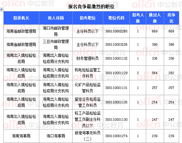 截止到8日16時,競爭比例的職位為海南省郵政管理局??谑朽]政管理局主任科員以下一職,招錄1人,截止到8日16時通過人數(shù)為669人。