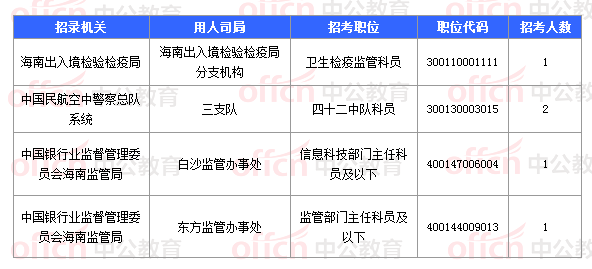 截止到8日16時,工作地點在海南的職位共有4個無人報考,占全部職位的2.44%。下面是無人報考職位一覽表,中公網(wǎng)校專家建議廣大考生多關(guān)注一些較冷職位,避免激烈競爭,結(jié)合自身條件,找到屬于自己的職位。