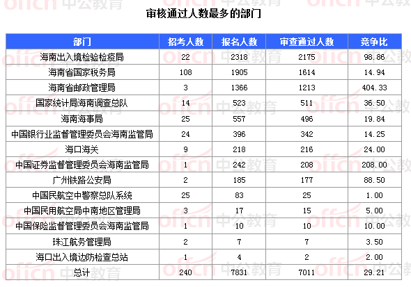 截止到8日17時30分,通過審核人數(shù)前三位的部門依次是:海南出入境檢驗檢疫局海南省國家稅務(wù)局、海南省郵政管理局、,三部門通過審核總?cè)藬?shù)達(dá)5002人,占通過審核總?cè)藬?shù)的71.34%。