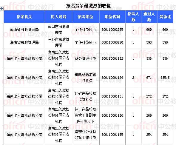 截止到8日17時30分,競爭比例的職位為海南省郵政管理局海口市郵政管理局主任科員以下一職,招錄1人,截止到8日17時30分通過人數(shù)為669人。