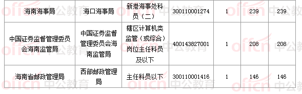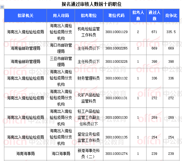 報名通過審核人數(shù)前十的職位主要集中在海南省郵政管理局、海南出入境檢驗檢疫局、海南海事局等部門,具體信息如下: