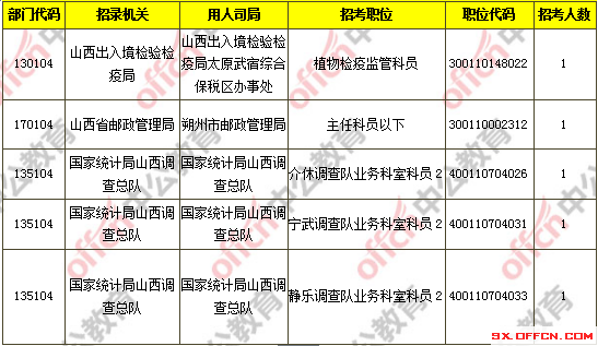 截止到11月8日17時(shí)30分,工作地點(diǎn)在山西的職位共有5個(gè)無人報(bào)考,占全部職位的1.26%。下面是無人報(bào)考職位一覽表,山西中公網(wǎng)校專家建議廣大考生多關(guān)注一些較冷職位,避免激烈競(jìng)爭(zhēng),結(jié)合自身?xiàng)l件,找到屬于自己的職位。