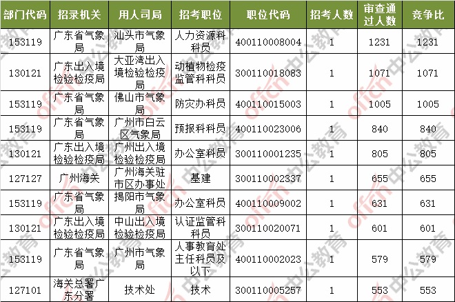 報(bào)名通過(guò)審核人數(shù)前十的職位主要集中在深圳海關(guān)、廣東省氣象局、珠海出入境檢驗(yàn)檢疫局等部門(mén),具體信息如下: