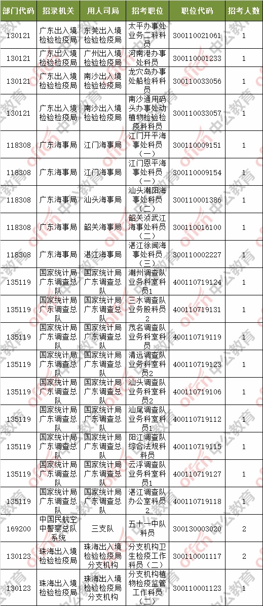 截止到8日17時(shí)30分,工作地點(diǎn)在廣東的職位共有21個(gè)無人報(bào)考,占全部職位的1.59%。下面是無人報(bào)考職位一覽表,中公網(wǎng)校專家建議廣大考生多關(guān)注一些較冷職位,避免激烈競爭,結(jié)合自身?xiàng)l件,找到屬于自己的職位。