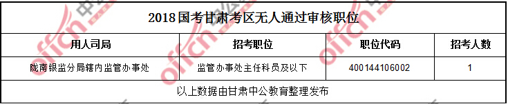11月8日17:30,工作地點(diǎn)在甘肅的職位共有1個(gè)職位無(wú)人通過(guò)審核,占全部職位的0.5%,1個(gè)職位無(wú)人報(bào)考,占全部職位的0.5%。下面是無(wú)人待審及無(wú)人報(bào)報(bào)職位一覽表,中公網(wǎng)校專家建議廣大考生多關(guān)注一些較冷職位,避免激烈競(jìng)爭(zhēng),結(jié)合自身?xiàng)l件,找到屬于自己的職位。
