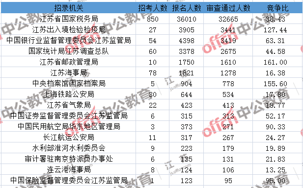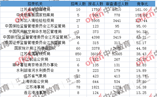 報(bào)名通過(guò)審核人數(shù)前十的職位主要集中在江蘇出入境檢驗(yàn)檢疫局、江蘇省郵政管理局、江蘇省國(guó)家稅務(wù)局等部門(mén),具體信息如下: