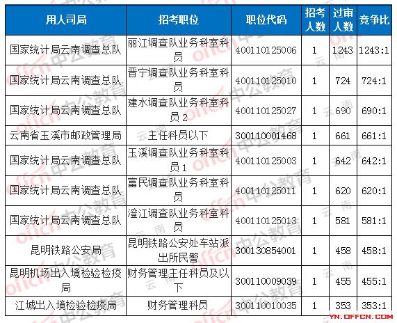 截止報(bào)名結(jié)束前最受歡迎的崗位是國(guó)家統(tǒng)計(jì)局云南調(diào)查總隊(duì),麗江調(diào)查隊(duì)業(yè)務(wù)科室科員,職位代碼:400110125006,招錄1人,1282人報(bào)名,其中39人待審核通過(guò),詳情如下圖: