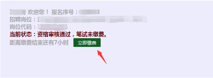 2、登錄后,如果當前狀態(tài)提示“資格審核通過,筆試未繳費”,可點擊狀態(tài)后面的“立即繳費”按鈕進行繳費。