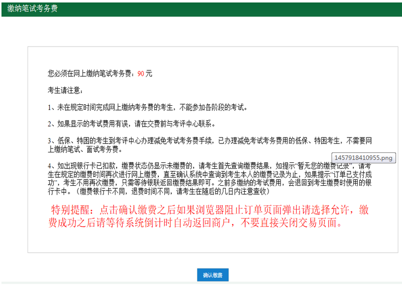 3、進入繳納筆試考務費頁面,請考生仔細閱讀注意事項和特別提醒。