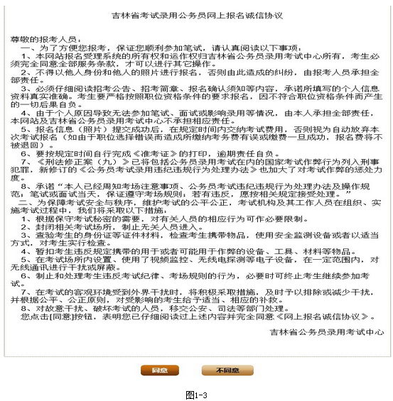 3、考生認(rèn)真閱讀‘吉林省考試錄用公務(wù)員考生誠信須知’(如圖1-3)后,點(diǎn)擊‘同意’即可進(jìn)入登錄及注冊(cè)頁面,如果點(diǎn)擊‘不同意’則返回到圖1-1頁面。