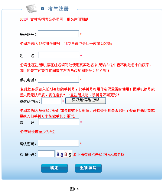 未注冊考生請注冊后再登錄,點擊圖1-4中的‘注冊新用戶’進入注冊頁面如圖1-5,請考生按提示填寫注冊信息。點擊‘確定’提交注冊信息,注冊后將返回圖1-4頁面進行登錄(返回登陸時自動把身份證號填充到身份證號文本框內(nèi))。