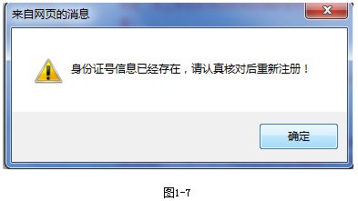 2、相同的身份證號只允許注冊一次,如多次注冊,則會提示錯誤,如圖1-7所示: