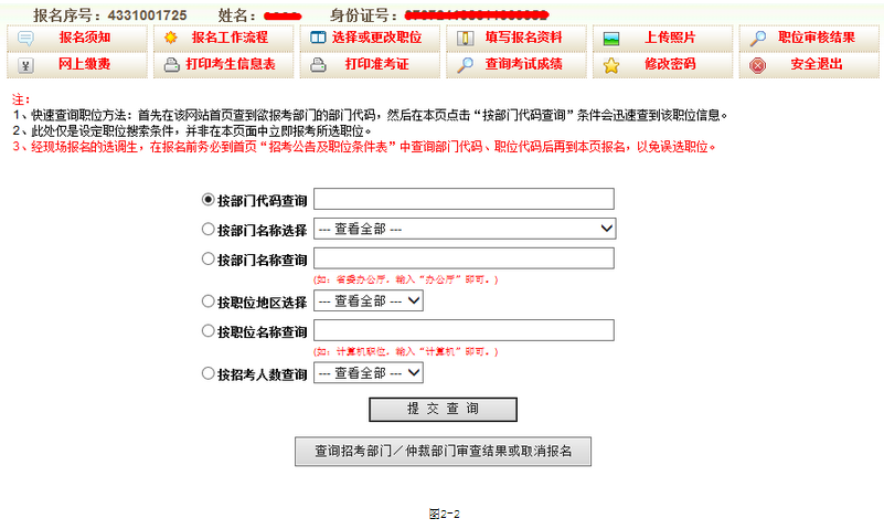 2、點(diǎn)擊‘選擇錄用職位’進(jìn)入職位查詢(xún)界面如圖2-2,可以按照不同條件查詢(xún)招考職位的情況。