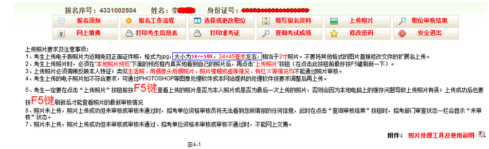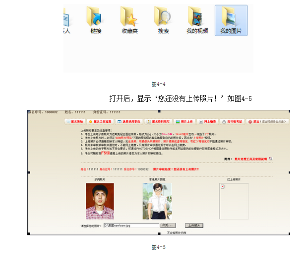 1、點擊‘照片上傳’進入照片上傳界面,上傳照片前請詳細閱讀‘上傳照片要求及注意事項’如圖4-1。