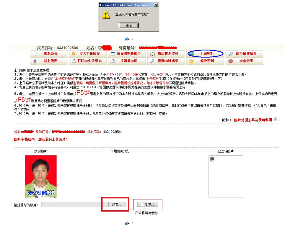 2、如果報名資料沒填寫,點擊‘照片上傳’按鈕就會有圖4-2提示。