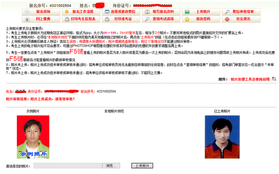 4、點擊‘上傳照片’按鈕,顯示‘已上傳照片,未審核,請等待審核!’如圖4-6,查看照片是否通過,可在圖4-6的頁面進行查看。需要注意:每次上傳或更換照片后必按F5鍵刷新,否則有可能在“本地照片預覽”框內(nèi)看到的是上一次的照片,導致上傳后的并非本人??忌牲c擊“不合格照片示例”按鈕查看不符合要求的照片(僅做示例)。