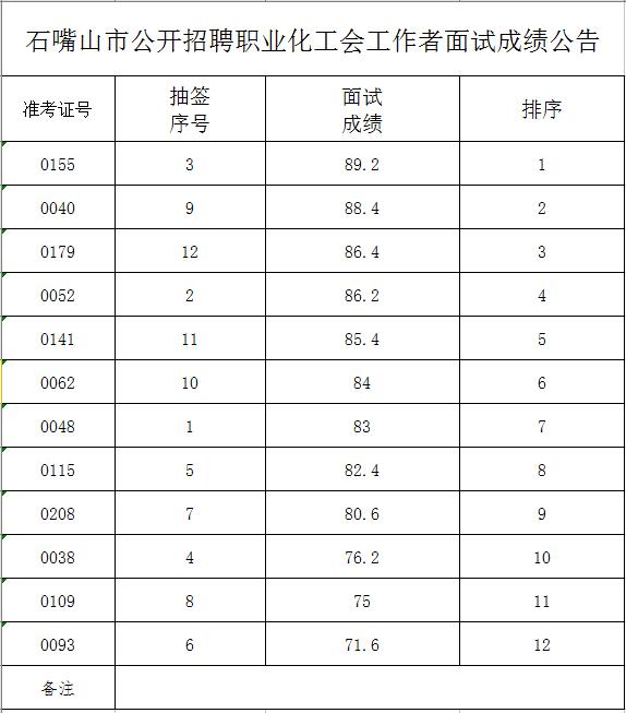 2015寧夏石嘴山市職業(yè)化工會工作者招聘面試成績公告