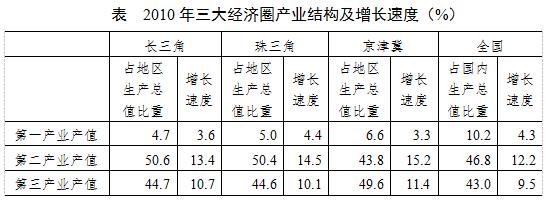 三大經(jīng)濟(jì)圈中,2010年三次產(chǎn)業(yè)增長速度均超過全國平均水平的有幾個?
