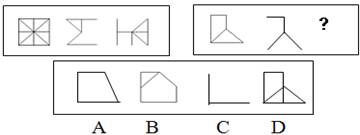 解答:正確答案為C。因為在第一套圖形中的后兩個圖形疊加在一起正好合成第一個圖形;在第二套圖形中的問號處如果為C項則與第一套圖形的規(guī)律一致。