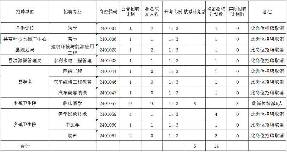根據(jù)2015年霍山縣部分事業(yè)單位公開招聘工作人員公告精神,下列招聘崗位因報考人數(shù)達不到開考比例或無人報考,按規(guī)定核減和取消招聘計劃數(shù),現(xiàn)公告如下,請報考取消招聘崗位的考生于4月30日13:00-17:00改報其他符合條件的崗位。逾期不改報的,按退費處理。