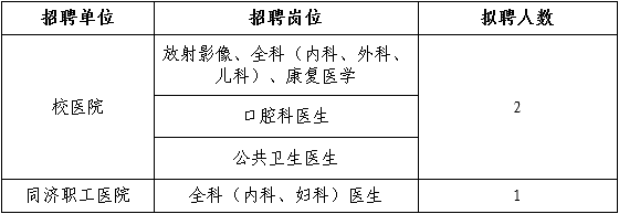 非應(yīng)屆人員應(yīng)為全日制本科及以上學(xué)歷,具有醫(yī)師資格證書(shū),中級(jí)及以上專(zhuān)業(yè)技術(shù)職稱(chēng)。中級(jí)職稱(chēng)者不超過(guò)40周歲(1979年12月23日之后出生),高級(jí)職稱(chēng)者不超過(guò)45周歲(1974年12月23日之后出生),急缺及特殊人才可適當(dāng)放寬。校醫(yī)院醫(yī)生應(yīng)聘人員需4年以上**醫(yī)院工作經(jīng)歷。同濟(jì)職工醫(yī)院有二級(jí)以上綜合性醫(yī)院5年工作經(jīng)驗(yàn)者優(yōu)先。