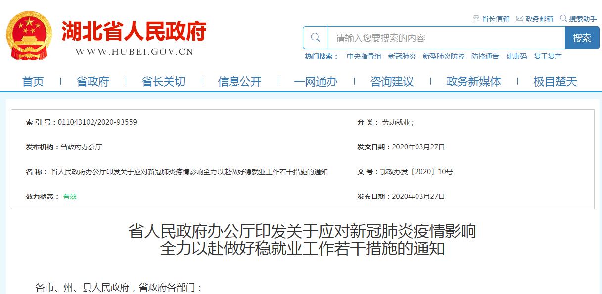 3月27日,湖北省政府辦公廳印發(fā)《關(guān)于應(yīng)對新冠肺炎疫情影響全力以赴做好穩(wěn)就業(yè)工作的若干措施》,圍繞全力推動安全有序復(fù)工返崗、支持企業(yè)減負(fù)穩(wěn)崗、促進(jìn)多渠道就業(yè)、促進(jìn)高校畢業(yè)生就業(yè)、推進(jìn)創(chuàng)業(yè)帶就業(yè)、實(shí)施就業(yè)扶貧、做好困難人員兜底、做實(shí)職業(yè)培訓(xùn)和就業(yè)服務(wù)、加強(qiáng)組織等9個(gè)方面,共計(jì)25條具體措施。