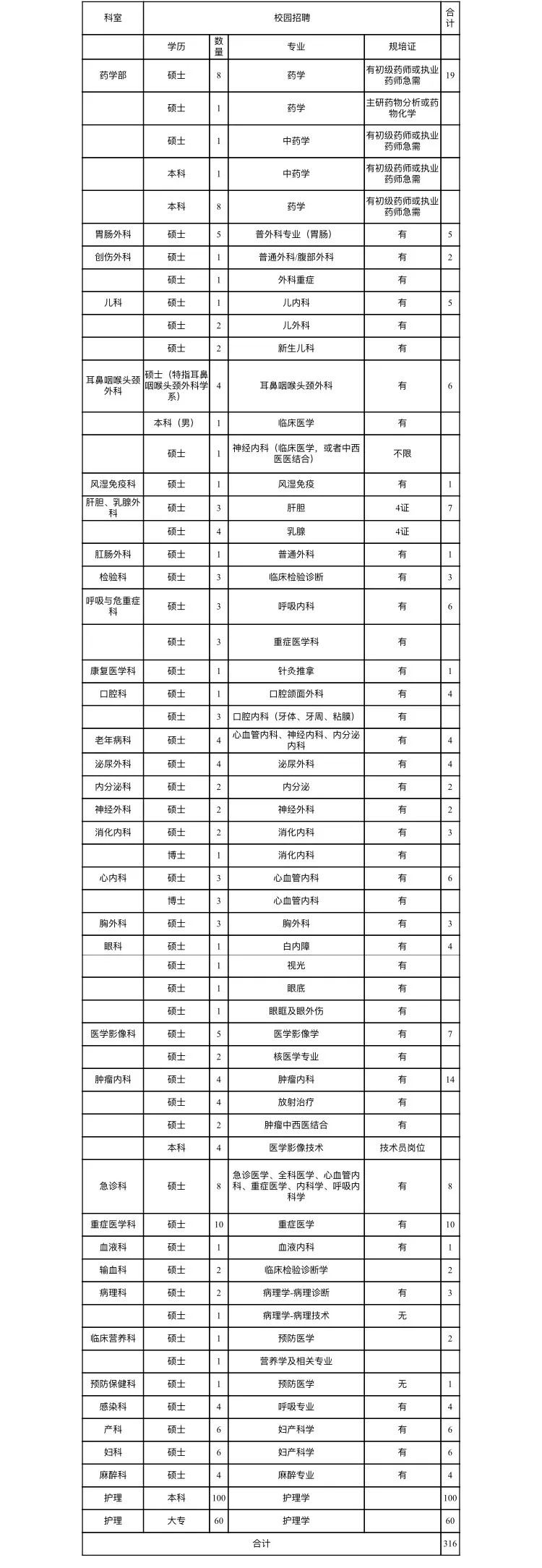 三、應(yīng)屆(2019、2020年)畢業(yè)生。醫(yī)療、醫(yī)技專業(yè)需取得碩士及以上學(xué)歷,取得執(zhí)業(yè)證書(shū)、規(guī)培證書(shū);藥學(xué)、檢驗(yàn)、技師專業(yè)需取得碩士及以上學(xué)歷,取得執(zhí)業(yè)證書(shū);護(hù)理學(xué)專業(yè)需取得統(tǒng)招全日制??萍耙陨蠈W(xué)歷(不含3+2???,要求高中起點(diǎn)(不含職業(yè)高中),取得護(hù)士執(zhí)業(yè)證書(shū);