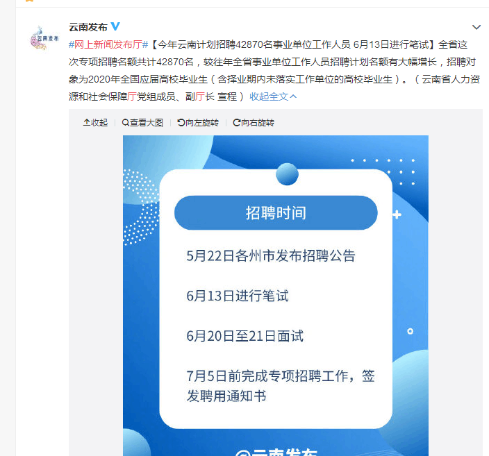 2020云南事業(yè)單位招聘考試有消息了,近日在中共云南省委宣傳部官方微博發(fā)布了一條關(guān)于2020云南事業(yè)單位招聘考試的消息,里面明確提到今年云南計(jì)劃招聘42870名事業(yè)單位工作人員 6月13日進(jìn)行筆試,全省這次專項(xiàng)招聘名額共計(jì)42870名,較往年全省事業(yè)單位工作人員招聘計(jì)劃名額有大幅增長,招聘對象為2020年全國應(yīng)屆高校畢業(yè)生(含擇業(yè)期內(nèi)未落實(shí)工作單位的高校畢業(yè)生)。以下是官方發(fā)布信息的截圖。