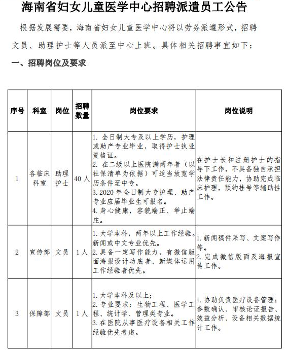 2020海南省婦女兒童醫(yī)學(xué)中心招聘派遣員工公告助理護(hù)士、文員公告【招43人】