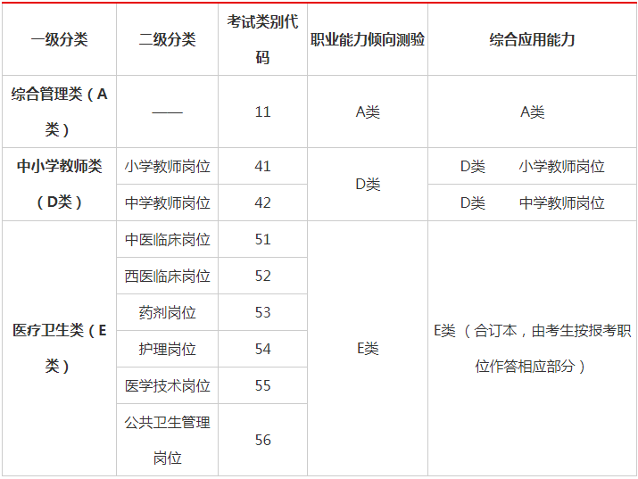 綜合管理類、中小學(xué)教師類、醫(yī)療衛(wèi)生類《職業(yè)能力傾向測驗》和《綜合應(yīng)用能力》滿分均為150分,筆試總分300分。衛(wèi)生類綜合應(yīng)用能力為合訂本,由考生按報考職位作答相應(yīng)部分。