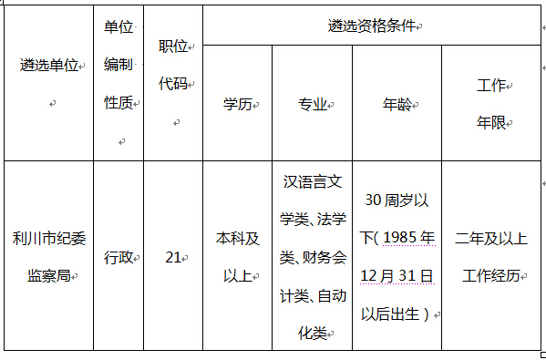 經(jīng)用人單位申請,市公開遴選領(lǐng)導(dǎo)小組研究決定,增設(shè)利川市紀(jì)委監(jiān)察局公開遴選工作人員職位,計劃遴選工作人員2名,該職位除報名時間延長至2015年7月10日上午12:00外,其余報考基本要求及報名、考試、考察、公示等程序要求與《利川市2015年市直單位第一次公開遴選公告(第1號)》一致。職位具體條件如下: