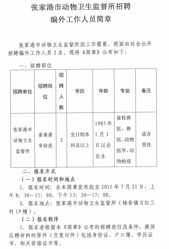 原標(biāo)題:2015張家港市動物衛(wèi)生監(jiān)督所招聘編外工作人員簡章
