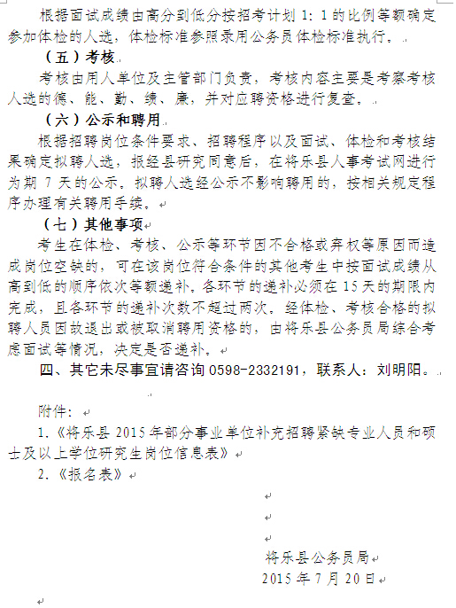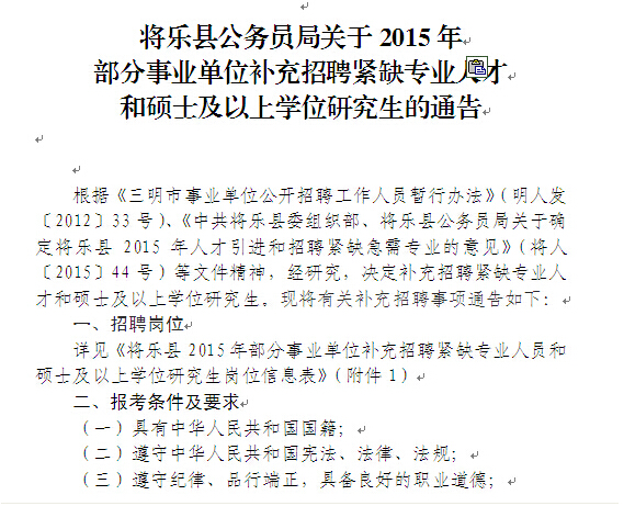 2015福建將樂(lè)縣事業(yè)單位補(bǔ)充招聘緊缺專(zhuān)業(yè)人才和碩士及以上學(xué)位研究生公告【招35人】