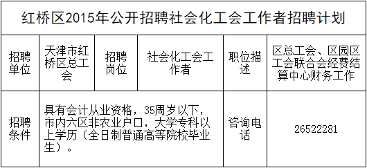 2015天津紅橋區(qū)社會化工會工作者招聘6人公告