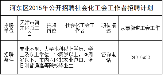 為適應(yīng)工會(huì)工作發(fā)展需要,根據(jù)市總工會(huì)《關(guān)于2015年選聘社會(huì)化工會(huì)工作者的通知》要求,河?xùn)|區(qū)總工會(huì)擬面向社會(huì)公開(kāi)招聘社會(huì)化工會(huì)工作者,現(xiàn)將有關(guān)事項(xiàng)公告如下: