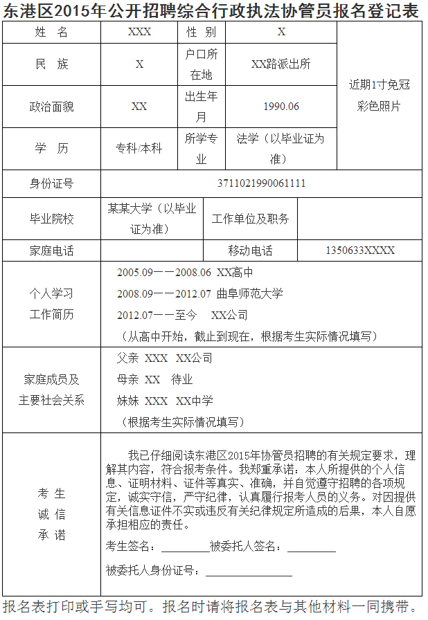 報名要求:報名時攜帶畢業(yè)證、報到證(未就業(yè)的),身份證及以上所有證件的復(fù)印件(A4紙)、戶口簿(或當(dāng)?shù)嘏沙鏊鶓艏C明)、近期1寸同底免冠彩照3張,已就業(yè)的需用人單位開具單位同意報考證明加蓋公章,報名與考試時使用的身份證必須一致,委托他人報名者,被委托人應(yīng)持身份證等有效證件。請考生自行打印并填寫招生簡章最下方的《東港區(qū)2015年公開招聘綜合行政執(zhí)法協(xié)管員報名登記表》,經(jīng)審查合格的人員,繳納考務(wù)費(fèi)40元。