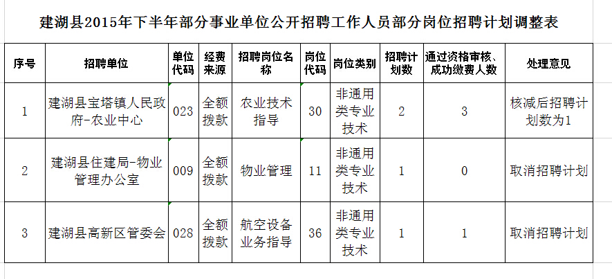 2、取消建湖縣住建局物業(yè)管理辦公室物業(yè)管理崗位(崗位代碼11)、高新區(qū)管委會(huì)航空設(shè)備業(yè)務(wù)指導(dǎo)崗位(崗位代碼36)等2個(gè)崗位的招聘計(jì)劃;