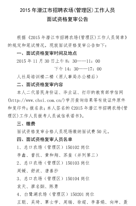 原標(biāo)題:2015年潛江市招聘農(nóng)場(管理區(qū))工作人員面試資格復(fù)審公告