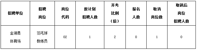 2015年金湖縣體育局公開招聘事業(yè)單位工作人員報(bào)名工作已經(jīng)結(jié)束。根據(jù)《2015年金湖縣體育局公開招聘事業(yè)單位工作人員公告》的規(guī)定,對(duì)達(dá)不到開考比例的招聘崗位予以取消?,F(xiàn)將取消崗位公告如下: