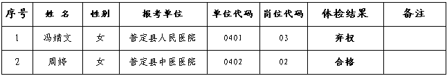 備注:普定縣面向社會公開招聘衛(wèi)生專業(yè)技術(shù)人員復(fù)檢或補(bǔ)檢合格人員進(jìn)入考察環(huán)節(jié),棄權(quán)人員取消考察資格。
