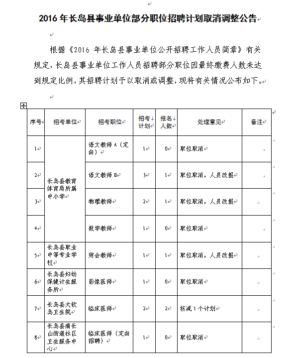 2016山東長(zhǎng)島縣事業(yè)單位招聘職位計(jì)劃取消調(diào)整公告